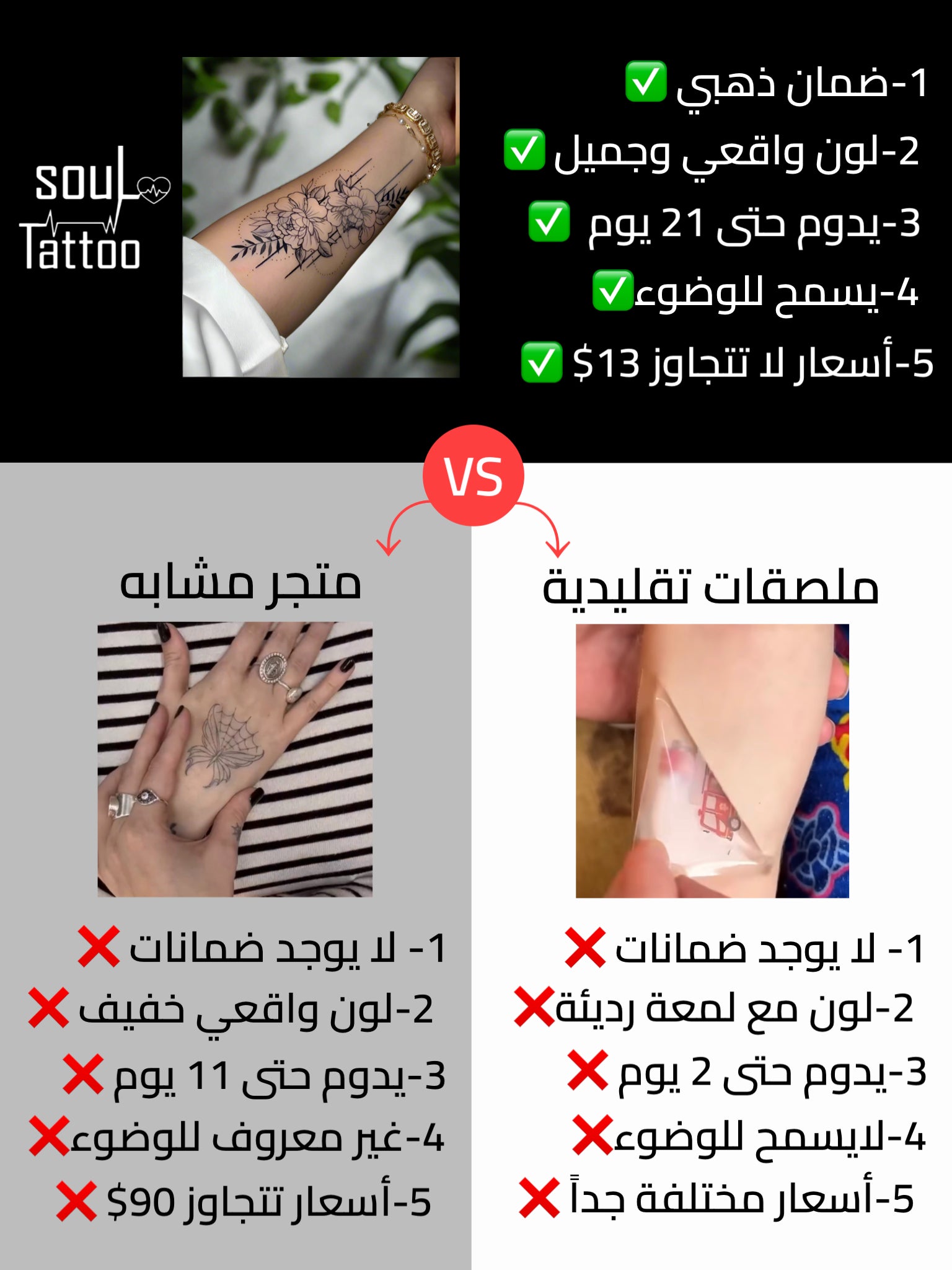 طريقة إستخدام المنتج :طريقة سهلة للإستخدام قصّ ملصق التاتو امسح الجلد المراد وضع التاتو عليه ألصق ملصق التاتو على بشرة نظيفة اضغط بقطعة قماش مبللة على ظهر ملصق التاتو انتظر 60 ثانية ثم انزع الغلاف الورقي ستظهر أفضل نتيجة خلال 12-24 ساعة